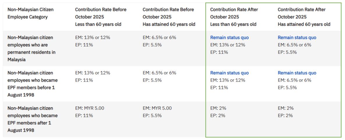 The table below outlines the specific contribution rates for different categories of non-Malaysian employees, showing the transition from previous rates to the new mandatory structure.