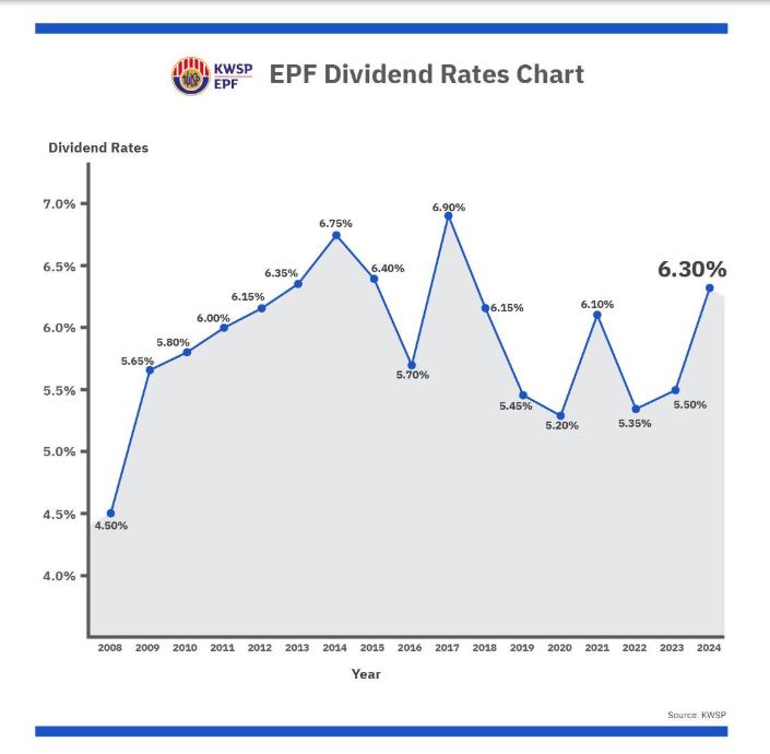 By law, the EPF is required to provide a government-guaranteed minimum dividend rate of 2.5% per annum, which can be significantly higher than the rates offered by most savings accounts or fixed deposits in Malaysia. This also makes EPF a more secure investment option compared to other volatile markets. However, since 2009, the EPF has been offering average dividend rates of more than 5% per year.